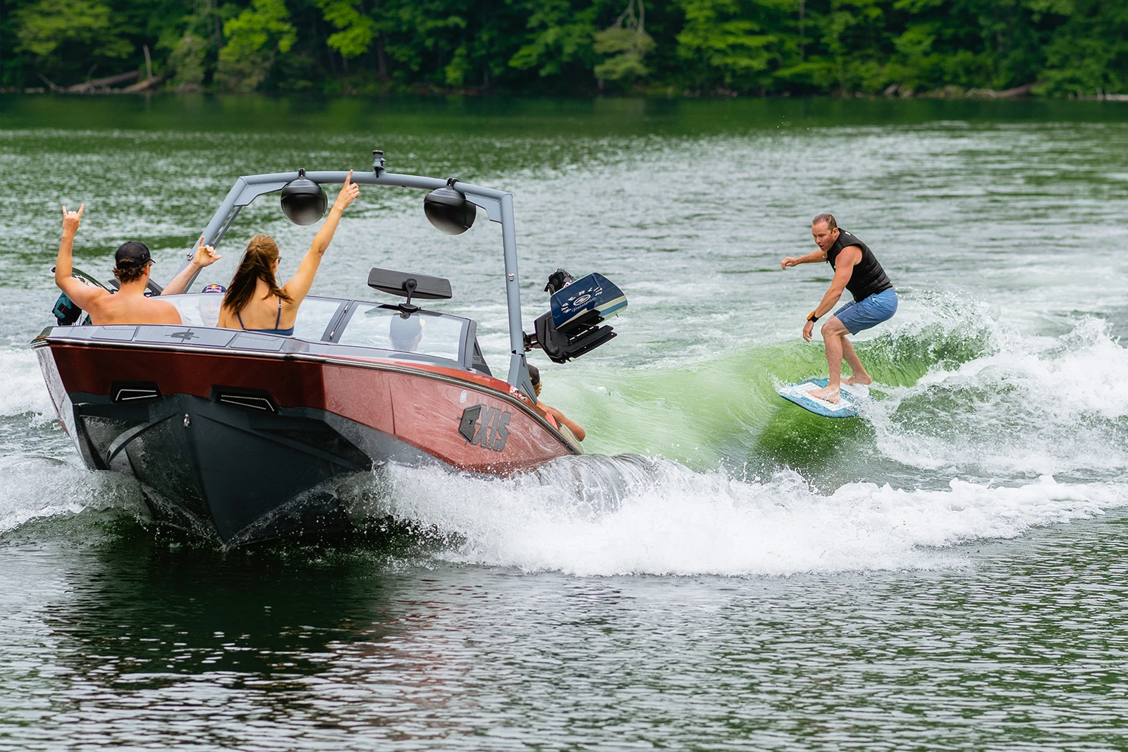 Axis boats feature Malibu’s patented Surf Gate™ system, which uses hydraulic gates on either side of the hull to redirect water flow and form a clean surf wave. Because the system is integrated into the boat’s design, riders can switch from port to starboard in seconds without moving ballast or passengers.
